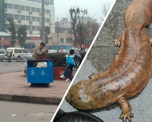 成都火車東站廣場外圍滿了人,大家都好奇地看著在地上爬來爬去的4個小家伙,它們可不是普通動物,而是國家二級保護動物——娃娃魚。它們的來歷撲朔迷離,據說是環衛工在打掃垃圾桶時,從一個塑料袋里翻出來的,究竟是何人所丟不得而知。現在4條娃娃魚被送往成都動物園,暫未有發現不適現象。