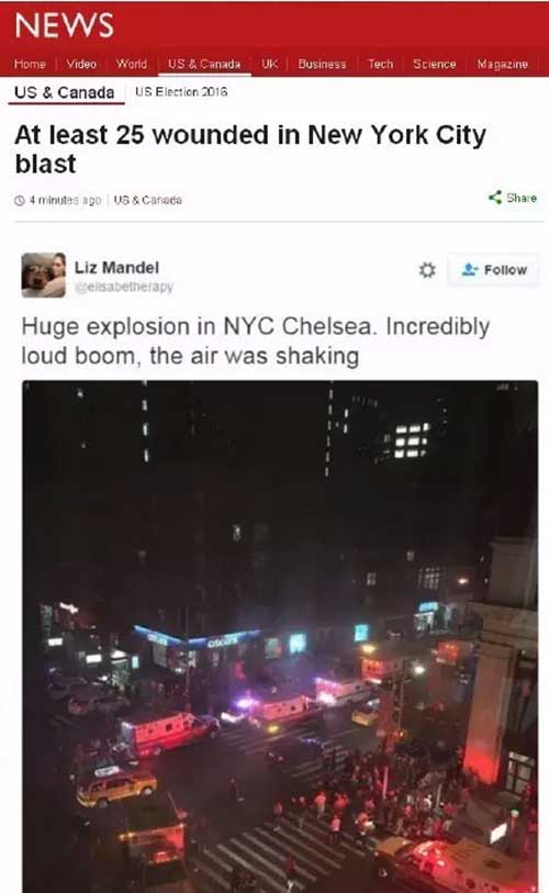 爆炸發生后,數百人已經撤離現場,紐約警方已經建議來往車輛和人群繞行該地區,警方也對該區的其他垃圾箱進行檢查,以防仍有炸彈。