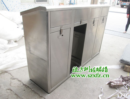 深圳師范學院附屬中學款式的C170五分類環保回收箱規格為:1600*400*860mm.外表是一款全新不銹鋼材質打造而成.不銹鋼垃圾桶頂部有五個垃圾投放組合,圓形垃圾投口分別左,右,中間,還有兩個半圓在中間部位。不銹鋼垃圾桶正面開有五個門,每一個門前都有一個小鑰匙配套開門。正面中間橫幅有LOGO的標準,還有深圳大學師范學院附屬中學字樣及英文拼音字母組合而成。不銹鋼垃圾桶五個取放垃圾內膽正門,絲印有五個垃圾投放標志。從左到右依次回收塑料罐,金屬罐,利樂包,紙張,有害垃圾及標志。不銹鋼垃圾桶外觀為方形,具有獨特的堅固耐用,不易破損;耐火安全,抗高低溫等優勢。適合各大院校,高檔場所使用。