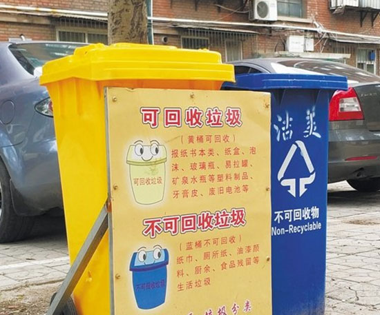 小區每棟居民樓前都擺放了黃色和藍色兩種顏色的塑料戶外垃圾桶,其中黃色垃圾桶前還用三角鐵架固定了提示牌,上面有清晰詳盡的使用說明,標明黃桶收集“可回收垃圾”,包括報紙書本類、紙盒、泡沫、玻璃瓶、易拉罐、礦泉水瓶等塑料制品以及牙膏皮、廢舊電池等;藍桶收集“不可回收垃圾”,包括紙巾、衛生紙、油漆顏料、廚余、食品殘留等生活垃圾。