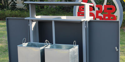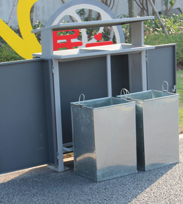 優質冷軋鋼板經剪板折彎焊接成型,酸洗磷化除油防銹工藝烤灰色戶外塑粉,桶身絲印垃圾分類標識有助從源頭精準投放,減量分類環保。