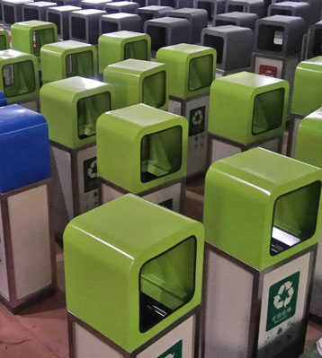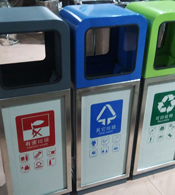 • 產品材質:三分類鐵板噴塑垃圾桶采用優質冷軋鋼經除油-除銹-表調-磷化處理后,表面采用汽車靜電粉末噴漆工藝,噴塑粉主要有丙烯酸粉末、聚酯粉末等。雙層防銹,漆面色澤耐久;