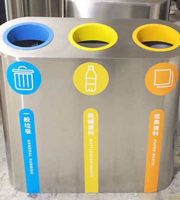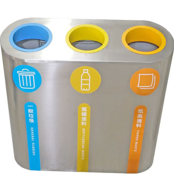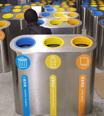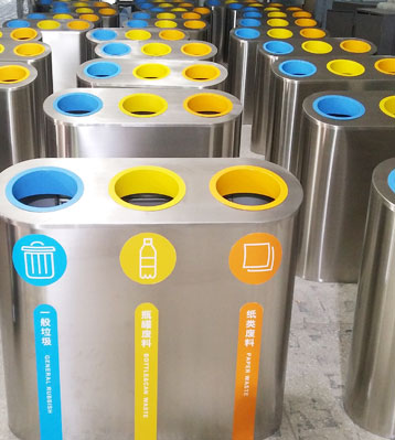 室內斜面投口地鐵不銹鋼三分類垃圾桶批量生產圖