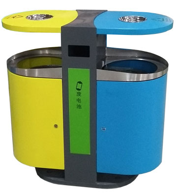 不銹鋼戶外果皮箱整體采用優質不銹鋼材質制作,立柱做深灰、分類桶身做黃藍烤漆工藝多層防銹更耐用,投口為不銹鋼本色,巧妙利用立柱空間做廢舊電池分類收集。