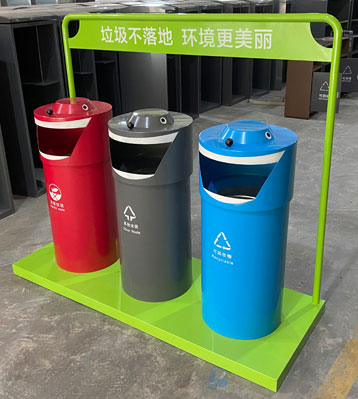 • 產(chǎn)品材質(zhì):戶外卡通三分類垃圾桶采用優(yōu)質(zhì)冷軋鋼材料經(jīng)剪鈑下料、折彎、沖壓、焊接、打磨、等工藝:表面經(jīng)過除油、噴砂防銹處理后,再進(jìn)行酸洗磷化處理;表面清理干燥后整體進(jìn)行靜電噴涂或烤漆處理,靜電噴涂是經(jīng)過流水線高溫固化爐固化后再出爐冷卻,加工后的塑粉附著力強(qiáng),不易剝落;