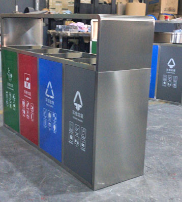 • 產品材質:戶外四分類垃圾箱根據客戶需求可采用201#,202#,304#優質不銹鋼材質模壓或焊接成型,面板可分色烤漆美觀耐用,不易破損;耐火安全,適合各種惡劣氣候條件;金屬亮澤,高雅美觀,廣泛適用于各種戶外場所;內外表面光潔,減少垃圾殘留,易于清潔;配置鍍鋅板內桶,便于垃圾清倒。
