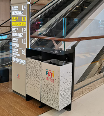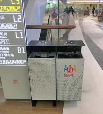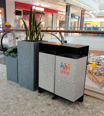 欣方圳商場不銹鋼烤漆景觀分類垃圾箱現場擺放圖